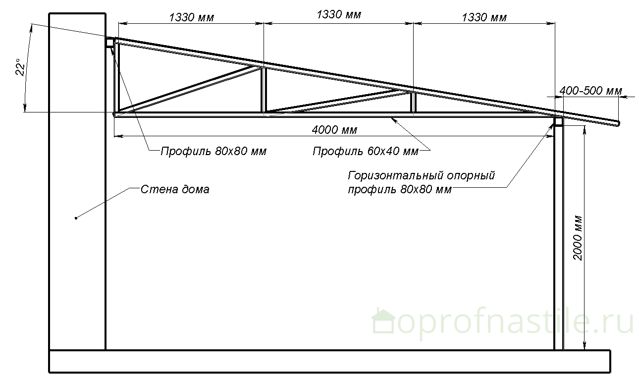- Кровельные фермы. При ширине навеса 4 метра и более используют фермы. . Сечение профиля для их изготовления подбирают в зависимости от размеров постройки. При ширине навеса 4-6 м. для верхнего и нижнего поясов формы берите профиль от 30*30 мм до 40х40 мм. Для раскосов – размеры те же.